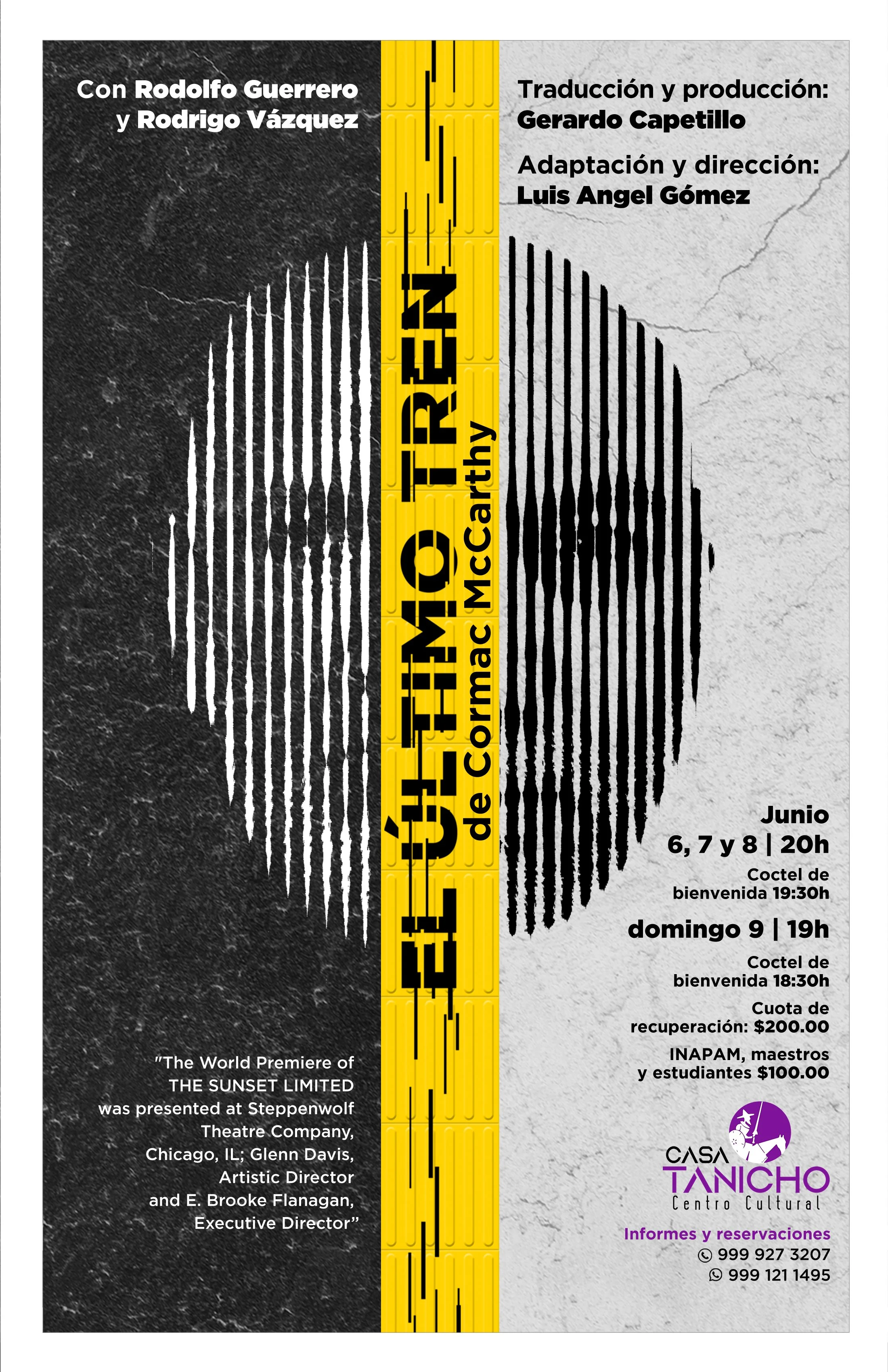 EL ÚLTIMO TREN, nos presenta un duelo de ideas entre un profesor nihilista, Blanco, y un expresidiario creyente, Negro, después que éste impidiera que aquél se suicidara arrojándose al paso del primer metro del día. Negro lleva a Blanco a su casa y, a lo largo de la obra, intentará convencerlo de que la vida tiene un propósito. La desolación y la esperanza están encarnadas en las palabras y cuerpos de ambos personajes, permitiéndonos ser testigos de un trepidante enfrentamiento de visiones sobre la vida y la muerte.